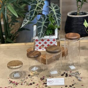 Round high borosilicate glass storage jar with screw acacia wood lid